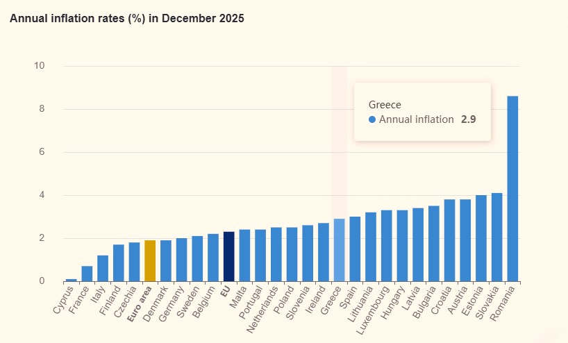 Eurostat: Στο 1,9% ο πληθωρισμός στην Ευρωζώνη τον Δεκέμβριο – Στο 2,9% στην Ελλάδα